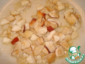 Пока картофель варится, на сковороде обжарим замороженные белые грибы.