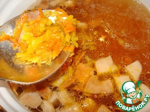 За 5 минут до готовности супа добавляем обжаренные овощи, солим по вкусу.