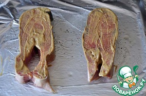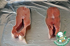 Берём стейки лосося, у меня кета, кладём на смазанный маслом противень. -