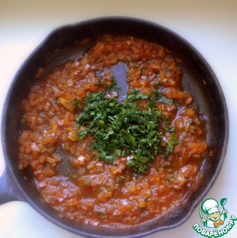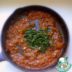 Добавляем к луку 2-3 ложки томатной пасты (лучше, если получится немного кислее, чем наоборот), сушеный базилик, солим-перчим. Тушим минут 5. В конце добавляем любую мелко нарезанную зелень.