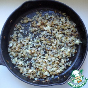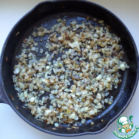• Берем две луковицы, мелко режем и обжариваем до золотистого цвета на постном масле. Обжариваем хорошо. Лук должен быть именно зажаренным, а не тушеным.