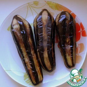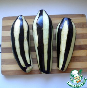 • С баклажан срезаем шкурку полосками. Вот так.