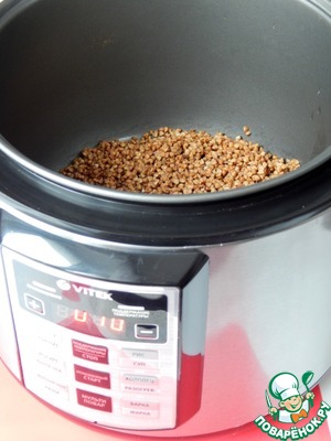 Гречку вымыть и обжарить в режиме «Жарка», постоянно помешивая, 10 мин.