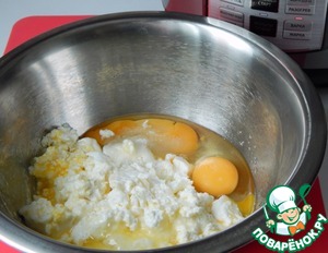 В миске растереть творог с сахаром и яйцами до однородной массы.