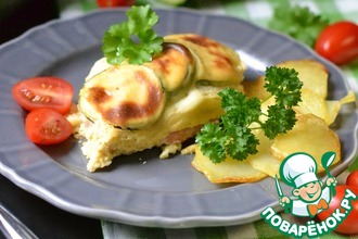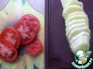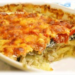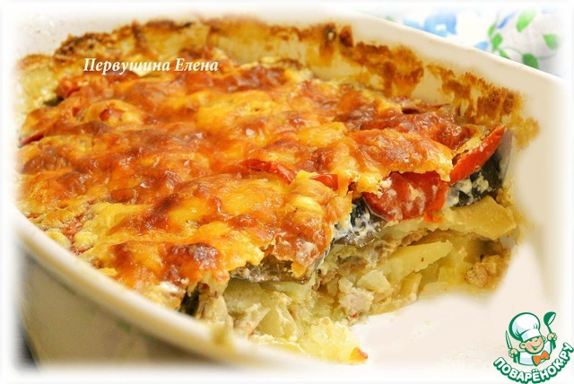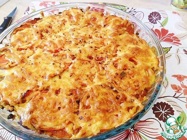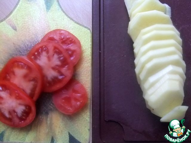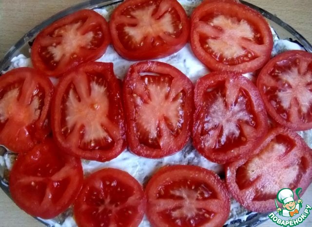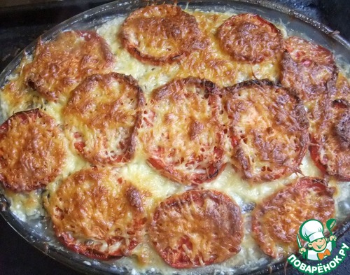 Сверху покрыть кружочками помидоров, присолить чуть-чуть. Поставить запекать на час - полтора, в зависимости от духовки, при 200 гр. Будет выделяться сок, но потом он постепенно выкипает.