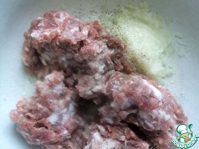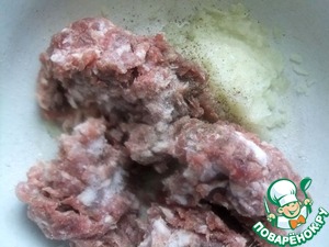 Фарш посолить и поперчить по вкусу, смешать с натертой на терке луковицей. Добавить молоко и хорошенько вымесить. Фарш должен быть очень сочным.
