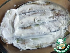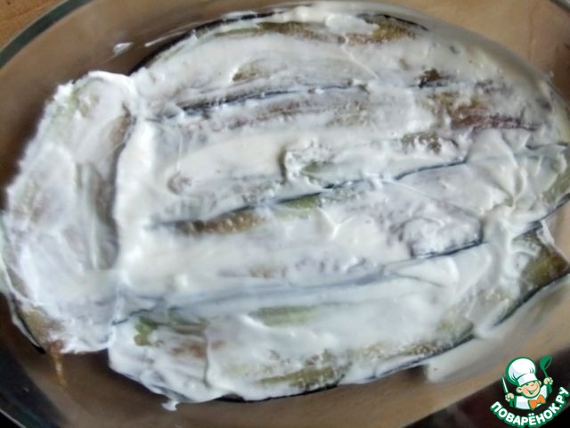 На дно формы уложить баклажаны вплотную друг к другу. Смазать сметаной или майонезом, как любите. Если используете сметану, то нужно немного подсолить.