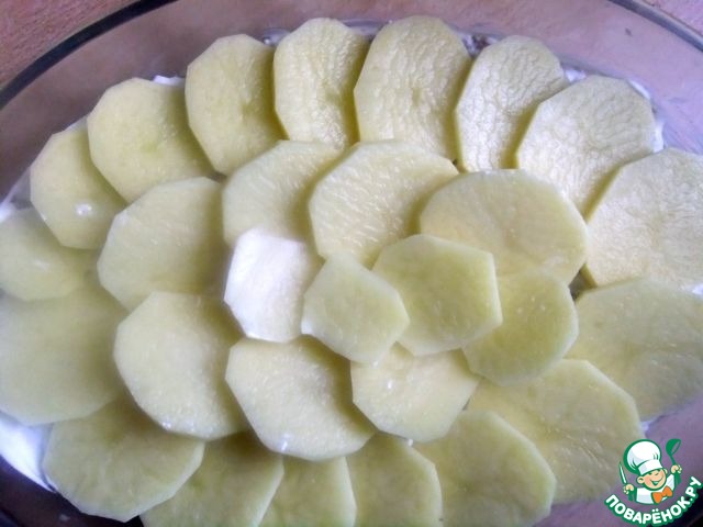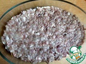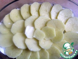 На фарш уложить в один слой картофель. Присолить по вкусу и поперчить, по желанию.