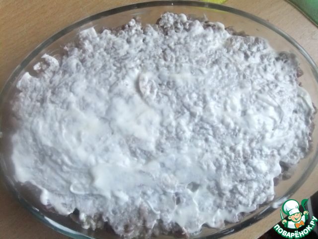 На него сверху распределить оставшийся фарш, смазать его сметаной.