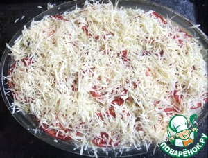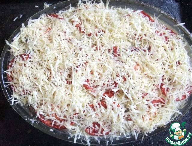 Затем достать форму из духовки и посыпать тертым сыром. Запекать далее до румяной корочки.