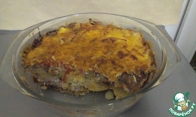 [+5]Делала конечно со сметанкой - вышло отлично, а дно формы я укрыла подрумяненными в духовке кусочками ржаного хлеба - он пропитался соками и получилась прекрасная основа!