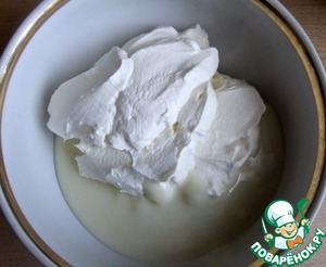 Сметану взбить со сгущеным молоком. Влить растопленный желатин, постоянно перемешивая массу. Оставить, чтобы чуть загустела.