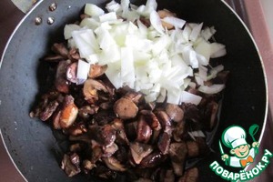 • Грибы вместе с одной луковицей и солью жарим на растительном масле до полного выпаривания жидкости и легкого зарумянивания, около 20 минут.