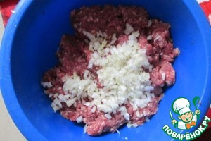 • В фарш добавляем соль, перец и ещё одну луковицу, которую мелко-мелко режем. Если фарш суховат, вливаем полстакана воды. Хорошо вымешиваем.