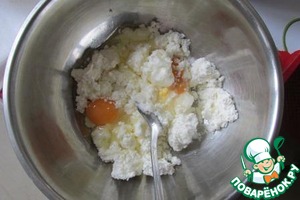 • Творог, яйца, соль и сахар хорошо растираем в однородную массу без явных крупных комочков.