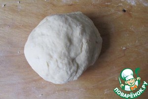 На доску высыпаем остаток муки, выкладываем тесто из миски и замешиваем плотное упругое тесто, как на пельмени.
