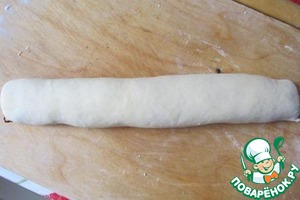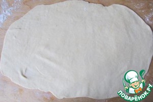 • Тесто делим на 2 части. Каждую часть раскатываем в тонкий овальный пласт. Приблизительно 40х20 см.