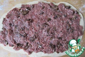 • Половину начинки выкладываем на лист теста и равномерно распределяем.