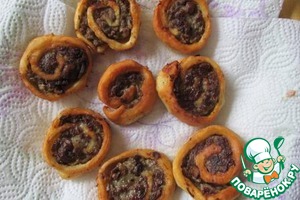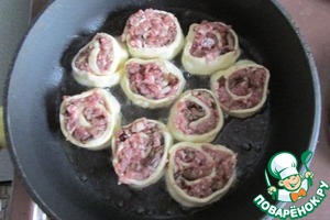 • Выкладываем завитуши в горячее масло, накрываем крышкой и жарим на огне ниже среднего с двух сторон до желаемой румяности. Не стоит витуши пересушивать. Мясной фарш жарится очень быстро, а грибы у нас уже готовые, поэтому процесс жарения не пускайте на самотёк.