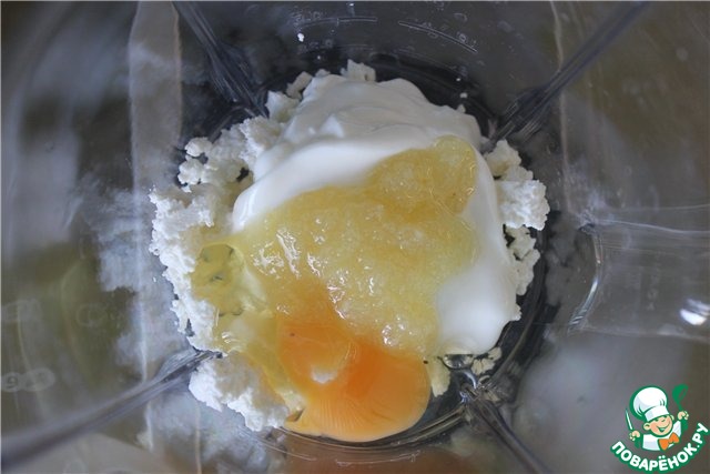 В блендере взбить творог, йогурт, яйцо и ложку сахара (или лимона с сахаром).