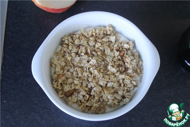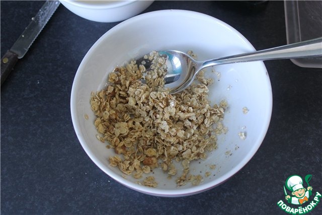 В отдельной плошке смешать овсяные хлопья, коричневый сахар, оливковое масло, корицу и измельченные грецкие орехи (я люблю, когда они крупными кусочками, поэтому просто ломаю их руками).
