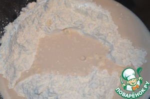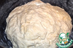 В глубокую чашу всыпать муку, сделать в середине углубление. Дрожжы, развести в маленьком количестве тёплой воды, добавить сахар. Влить дрожжевую смесь в углубление муки, размешать пальчем, добавить соль, растопленное, тёплое сливочное масло и остаток воды. Замесить тесто. Тесто должно быть мягкое, немного прилипать к рукам.