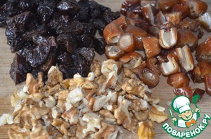 Пока тесто подходит, подготовить сухофрукты и орешки. Из фиников вынуть косточку, всё нарезать, сильно не мельчить.