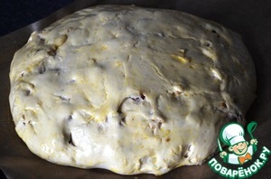 Когда тесто поднялось, замесить в него равномерно сухофрукты и орехи. Сформировать хлеб, (как вам больше нравится). Я попыталась спрятать сухофрукты и орешки в тесте, чтобы они не подгорели. Накрыть хлебушек чистым полотенцем и поставить ещё подходить, на 1 час.