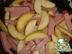 Растопить на сковороде половину масла и положить свинину и яблоки. Жарить на слабом огне несколько минут, пока яблоки не станут мягкими и не выделится сок. Влить бульон и проварить еще 1-2 минуты. |