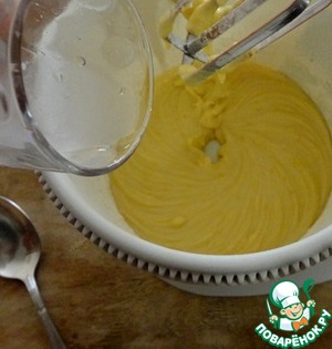 Продолжая взбивать, добавить муку просеянную с солью и соду (разведенную в 2-х ложках горячей воды)