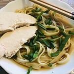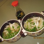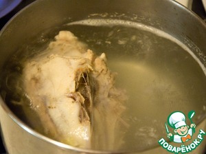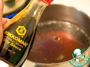 Достать курицу и добавить соевый соус в бульон по вкусу.