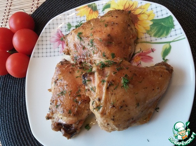 После маринования курицу положить в пакет для запекания (можно в фольгу) и отправить в духовку при температуре 200 градусов минут на 50.