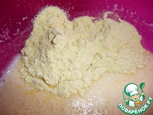 Муку смешать с разрыхлителем теста, добавить в смесь и продолжить взбивать миксером.