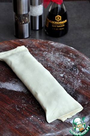 Тесто раскатать скалкой, слегка посыпая мукой.