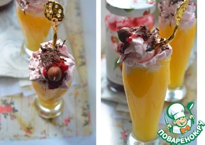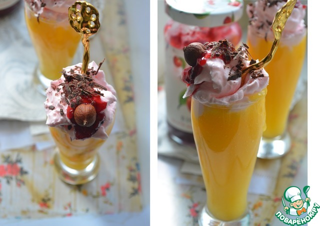 Вкусный персиковый десерт, с вишневым конфитюром, горьким шоколадом и нежной шапочкой из взбитых сливок. Такой десерт поднимет Вам настроение в любое время суток!