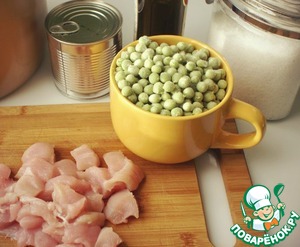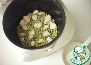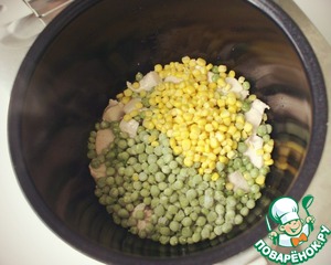На программе "поджаривание" на оливковом масле обжарим курицу, добавим кукурузу, горошек.