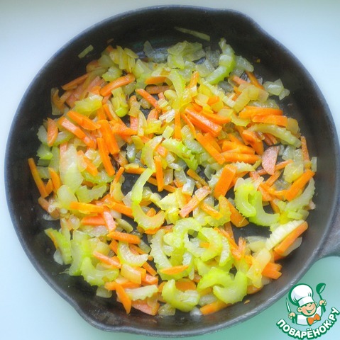 Овощи - лук, морковь и сельдерей - режем произвольно и обжариваем в небольшом количестве постного масла. Перекладываем в кастрюлю, заливаем горячей водой (жидко быть не должно), добавляем специи, сушеную петрушку и варим минут 5-10.