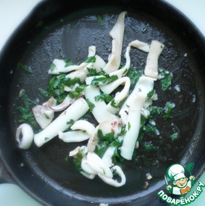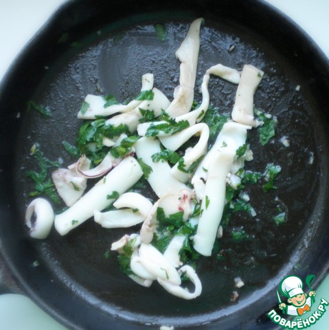 ... еще маленький штрих. Кальмары! Сырые кальмары очищаем, нарезаем довольно крупно и быстро (буквально в течение минуты) обжариваем на постном масла. Туда же в сковороду добавляем мелко нарезанный чеснок и зелень петрушки.