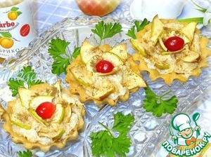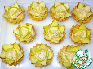 В остывшие корзиночки выкладываем яблочно-белковую смесь, затем тонко нарезанные ломтики яблока,