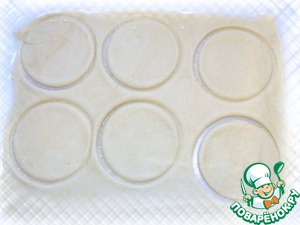 Раскатываем и вырезаем кружочки немного больше, чем диаметр формочки. У меня вышло 11 шт., чем тоньше, тем лучше.