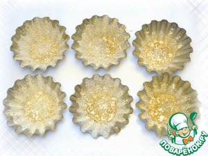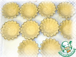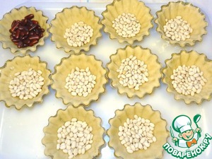 Для сохранения формы во время выпекания в формочки положить сухую фасоль или горох. Поставить формочки на противень. В духовом шкафу установить температуру около 190-200 градусов. Выпекать корзиночки в течение 10-15 минут, не больше, иначе пересушите.