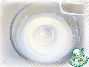 Готовим начинку: берем яичный белок, взбиваем с маленькой щепоткой соли, и постепенно добавляем частями 30 г сахара и взбиваем до твердых пиков.