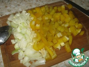 Обжарить в кастрюле в растительном масле мелкопорезанные лук, чеснок и сладкий перец до легкого золотистого цвета.