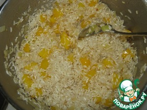 Добавить к овощам рис, тщательно перемешать, чтобы каждая рисинка оказалась смазанной маслом.