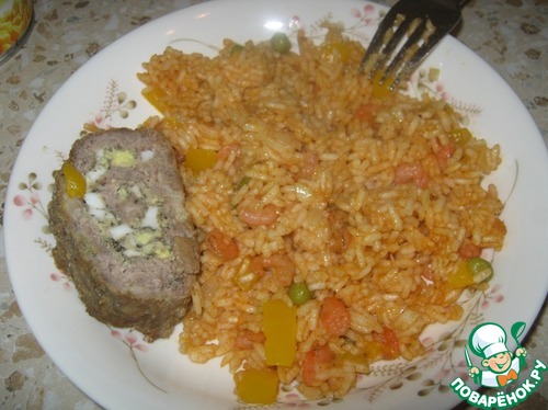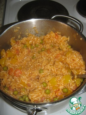 Добавить томатную пасту и 2 стакана воды/бульона. Посолить по вкусу. И оставить на слабом огне на 15-20 минут до готовности риса.