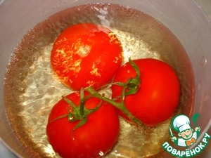 Вымыть помидоры и ошпарить их кипятком, чтобы легче было удалить верхнюю кожицу.