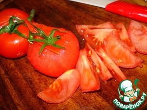 Нарезать помидоры дольками.