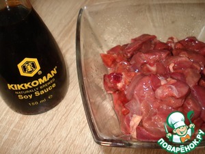 Куриную печень хорошо промойте и нарежьте небольшими кусочками, сбрызните соевым соусом Kikkoman.