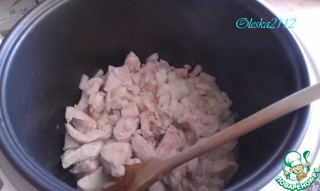 Куриную грудку режем кусочками. В чашу мультиварки вливаем 1 ст. л растительного масла и выкладываем курицу. Выбираем режим "Жарка" 15 минут, обжариваем, прикрыв крышкой, и периодически поворачивая.