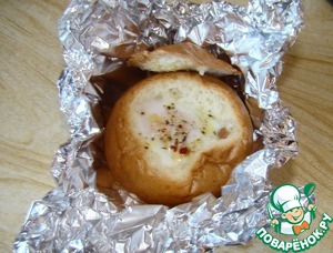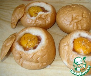 Затем собираем наши булочки. В каждую булочку выкладываем сначала сыр, затем обжаренные сосиски. Сверху осторожно выливаем сырое яйцо. Солим и перчим по вкусу, учитывая, что булочки, сыр и сосиски уже соленые. Прикрываем каждую булочку своей срезанной "крышечкой".